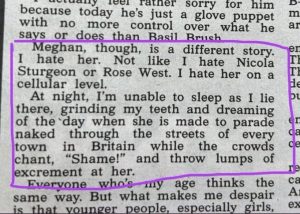 “dreaming of the day when she is made to parade naked through the streets of every town in Britain while the crowds chant, ‘Shame!’ and throw lumps of excrement at her”